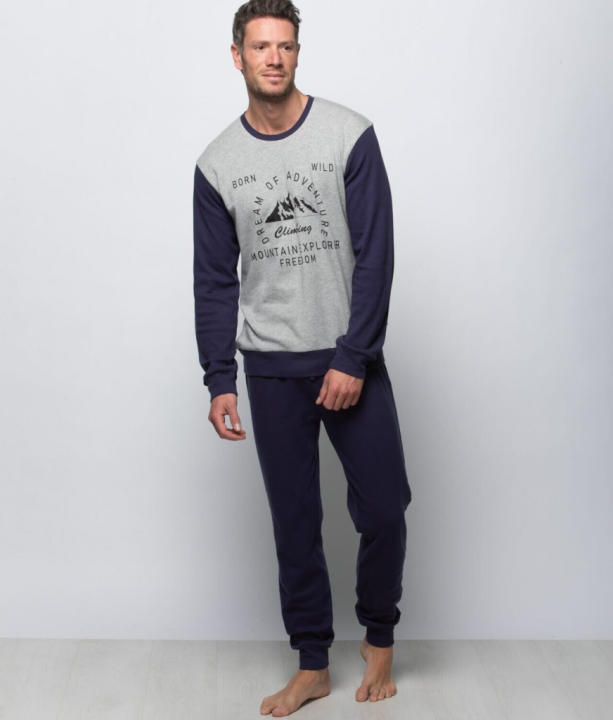Pijama largo confeccionado en tejido interlock. Camiseta de manga larga con cuello panadero, bolsillo con logo estampado y con puños. Pantalón largo con cintura elástica y cordones, bolsillo trasero y con puños. Empaquetado en caja. Fabricado en España. Materiales de calidad.
