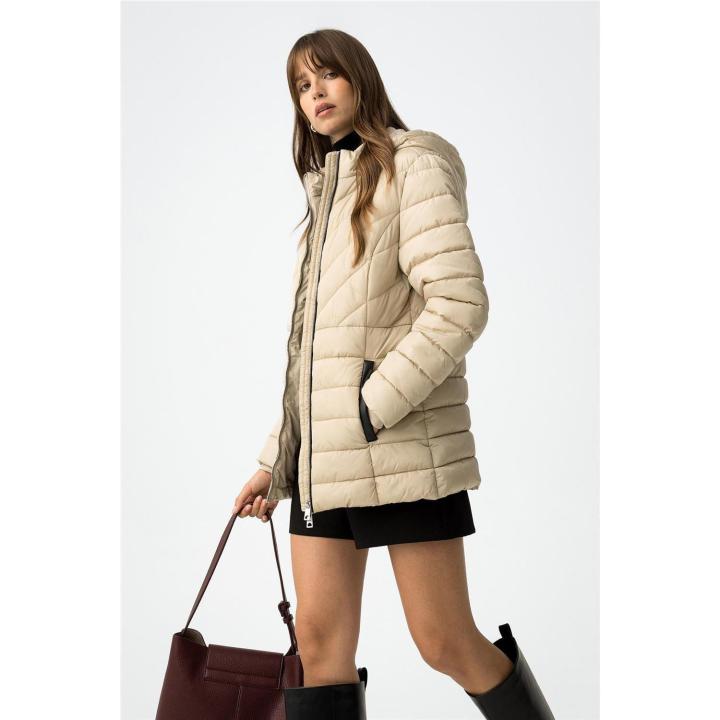Cazadora acolchada regular fit, con dos bolsillos frontales, contrastes efecto piel y cierre de cremallera. Capucha ajustable y desmontable. Cuello alto y manga larga con puños de canalé.