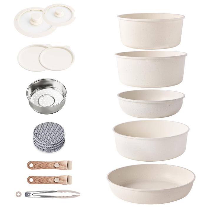 💎 Nuestra batería de cocina tiene una base de inducción superpuesta y es apta para placas de inducción, gas, cerámica, horno y otros tipos de placas. (Por favor, retire la tapa y las asas antes de meterla en el horno)