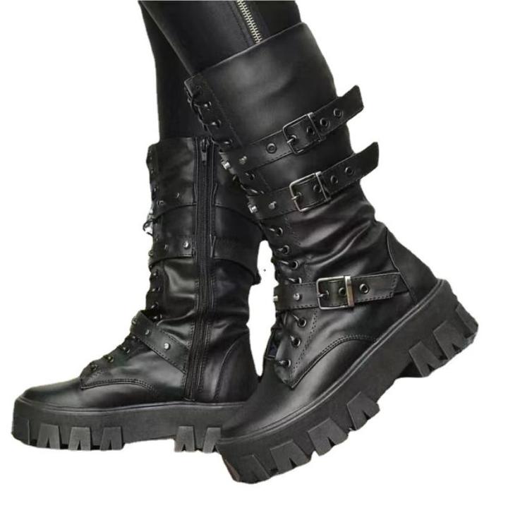 SP Botas de Mujer otoño E invierno nuevas con Cordones, cinturón de cinturón, BOTAS de moto de Tacón Bajo y Tubo Medio, BOTAS de Caballero de talla grande para Mujer,