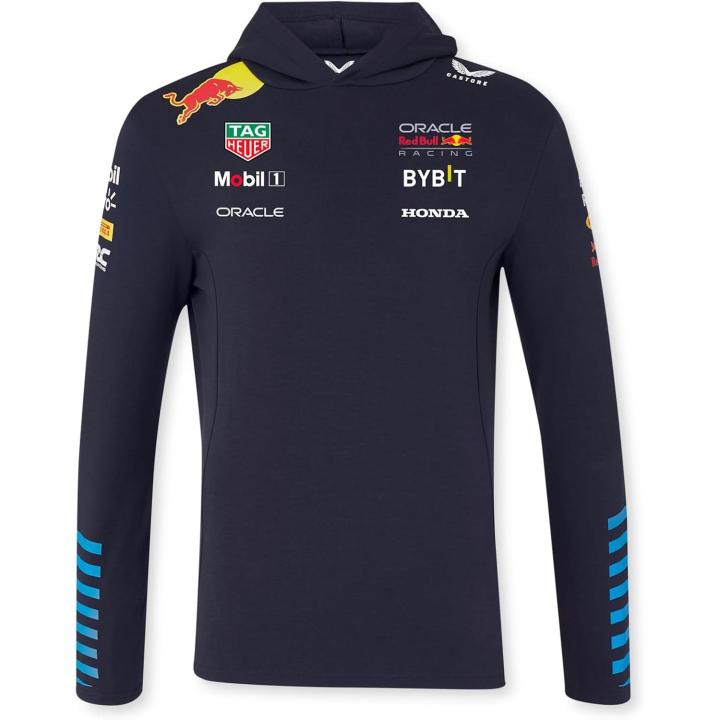 🏁 Sudadera oficial del equipo Red Bull Oracle Formula 1 🧢 Con capucha ajustable, bolsillo tipo canguro y logotipos bordados 🧵 Fabricada por Castore en tejido técnico de alto rendimiento 🌬️ Composición: 80 % algodón, 20 % poliéster – suave, cálida y resistente 🎯 Corte regular fit, ideal para uso casual o estilo deportivo 🔝 Diseño exclusivo del equipo Red Bull Racing F1