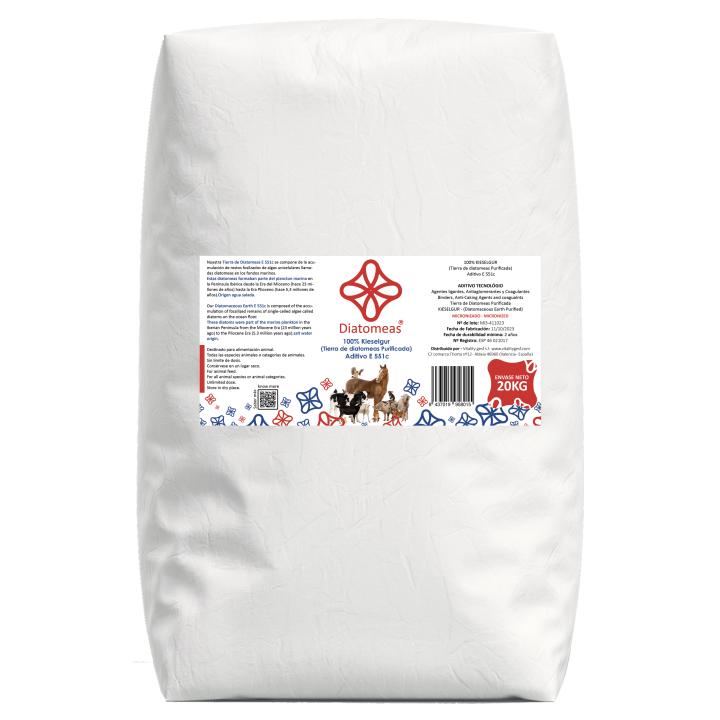 ● Tierra de diatomeas purificada, no calcinada, conforme a la definición del aditivo E551c. Presentación: saco de 20 kg.