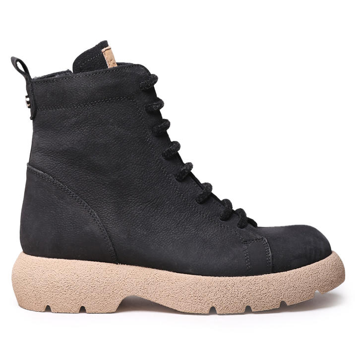 DASHA. Este botín con cordones para mujer está elaborado en piel nobuk en tonos lisos. La suela contrastada es de goma antideslizante. Tiene una altura total de 4,5 cm. La plantilla interior está forrada en tejido transpirable y está acolchada para mayor comodidad. Este modelo calza la talla habitual, si estás entre dos números, escoge la más pequeña.