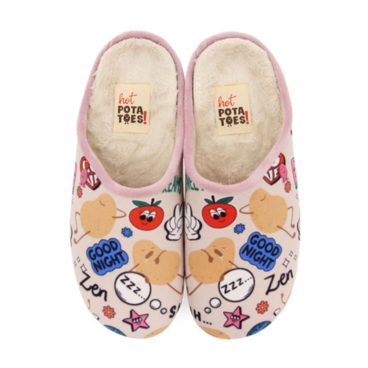 Zapatillas de estar por casa para mujer de la marca española Hot Potatoes tipo babucha color malva con estampados de patatillas. El ribete es de pelo muy suave. La plantilla es extraíble con materiales 100% reciclados; la suela de goma natural y pintas de goma EVA reciclada de colores y el forro transpirable.