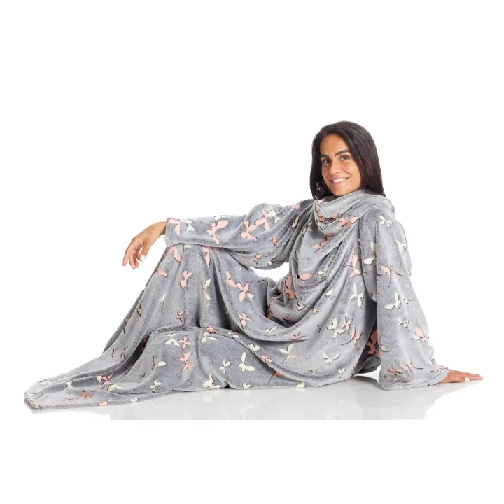 Canguro, Manta con Mangas Luminosas, BRILLAN EN LA OSCURIDAD, Felpa a cuadros, Microfibra, con patrón de bolsillo central Mariposas, Individual, 180x140cm, Felpa para mujer, Manta individual de felpa, Manta a cuadros para sofá o cama.