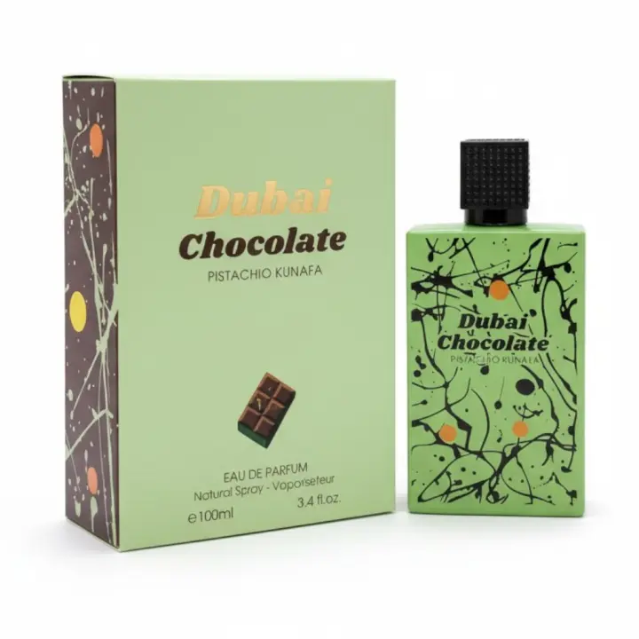 Dubai Chocolate Pistachio Kunafa Eau de Parfum. Aroma dulce y gourmand con pistacho cremoso y acorde inspirado en kunafa. Fragancia intensa, cálida y envolvente, perfecta para destacar en cualquier ocasión. 🚚 Envíos a España 24/48h.