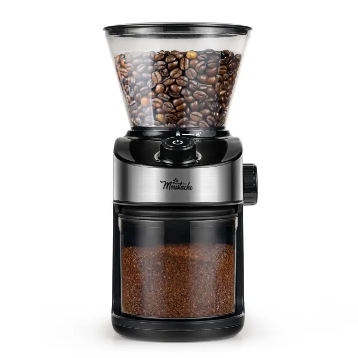 LA MOUSTACHE Molinillo de Café Eléctrico 200W, Capacidad 190gr, Mecanismo de Rebabas Planas