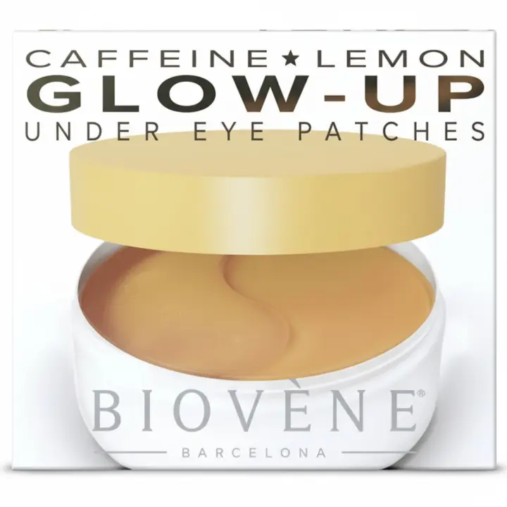 Parches Glow-Up Caffeine Lemon Biovène Barcelona. Tratamiento iluminador con cafeína y limón para ayudar a reducir bolsas y ojeras, aportando efecto refrescante e hidratante. Tarro con 60 parches (30 pares) + espátula. 🚚 Envíos a España 24/48 horas