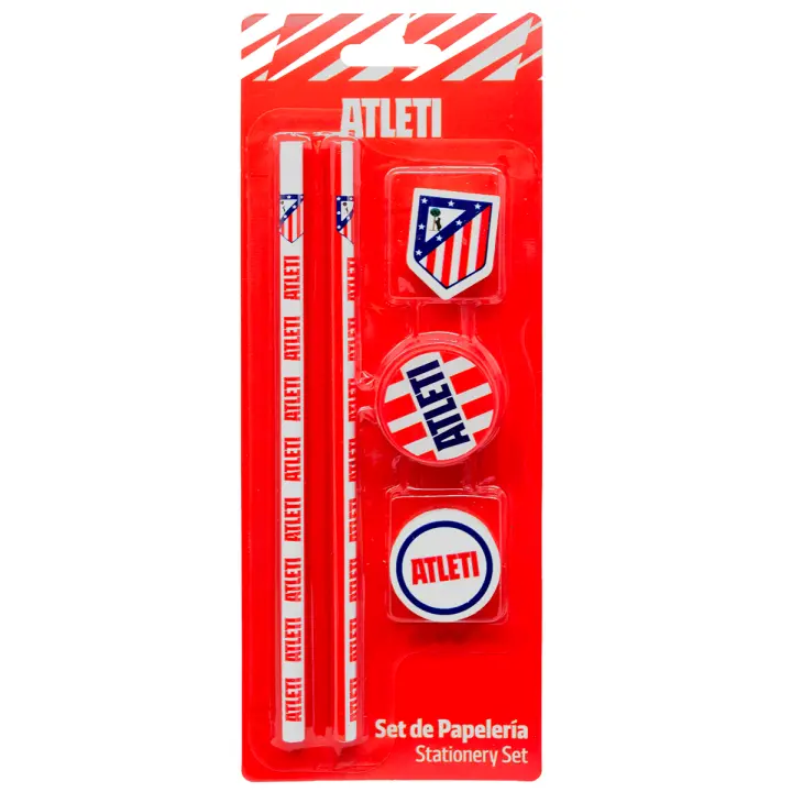 Set de Papelería Atlético de Madrid Oficial | Incluye 2 Lápices, 2 Gomas de Borrar y 1 Sacapuntas | Producto Licenciado Rojiblanco | Material Escolar y de Oficina | Regalo Original para Niños, Estudiantes, Aficionados y Coleccionistas Colchoneros