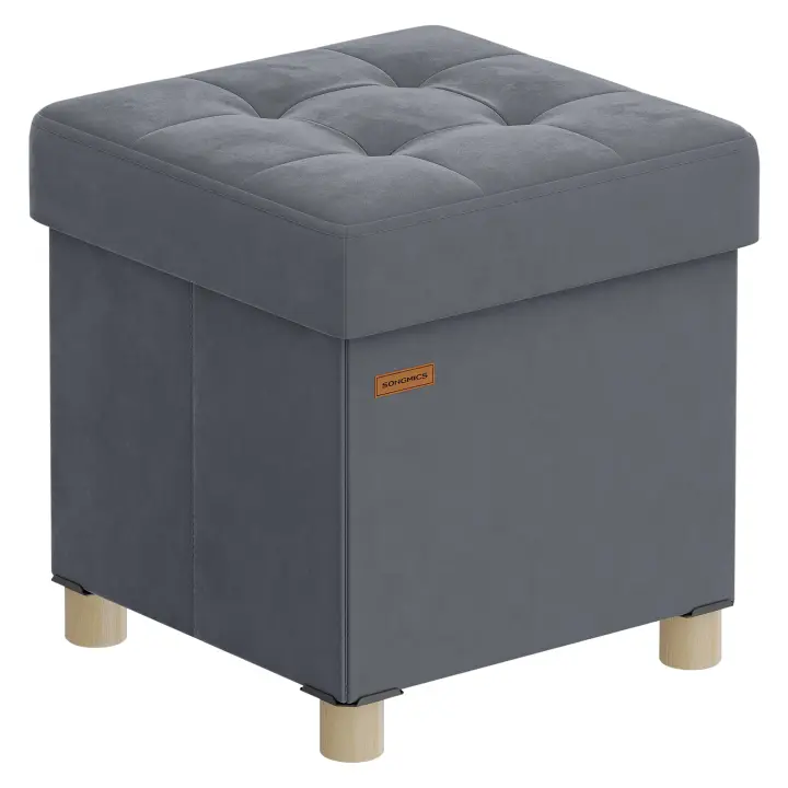 SONGMICS Puff Almancenaje, Banco Almacenaje, Taburete con Reposapiés, Plagable, Banco con Almacenamiento, 32 x 40 x 33,5, para Sala de Estar, Dormitorio, Gris Oscuro/Negro