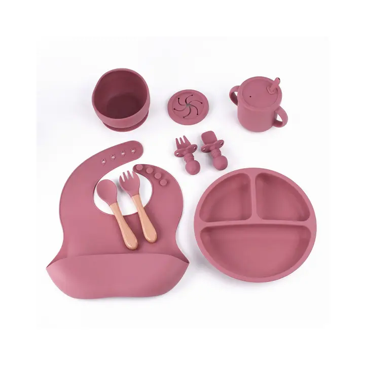 ZLY Vajilla de Bebé Silicona, 10 piezas de Vajilla Infantil, Cuadertos con Plato Sucker, Plato Bebe Ventosa,Tenedor con Mango De Madera, ,Bebe de silicona, Babero Set vajilla silicona Bebe