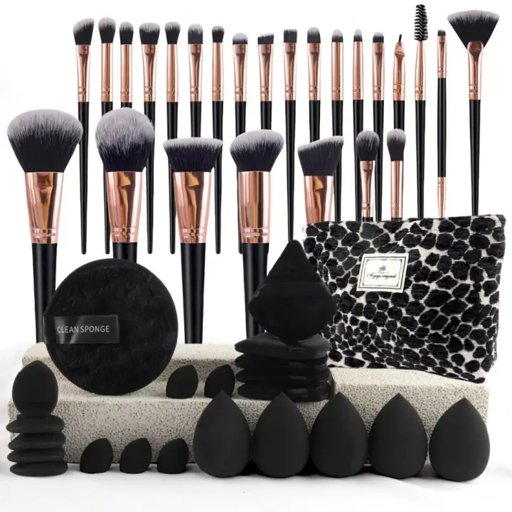 TK Estuche de maquillaje combinado de 47 piezas con herramientas, incluye neceser, juego de brochas de maquillaje, bolsa de aseo, bolsa de viaje, borlas y accesorios de maquillaje (Estampado de leopardo negro, 47 piezas).