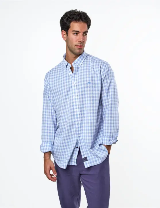 Camisa marca Spagnolo de hombre Cutaway Vichy en tejido de Lino/Algodón Azul SPAGNOLO