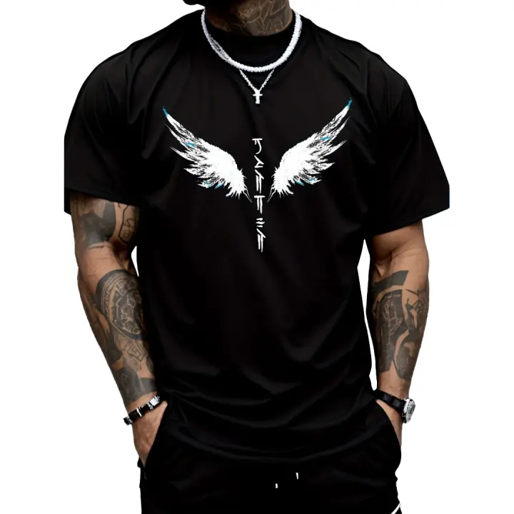 Camiseta con estampado de caligrafía japonesa con alas de ángel para hombre, informal, versátil, de manga corta, con cuello redondo, diseño de alas blancas y azules, ligera para fitness y ocio, 100% algodón | Ropa casual inteligente | Tela ligera