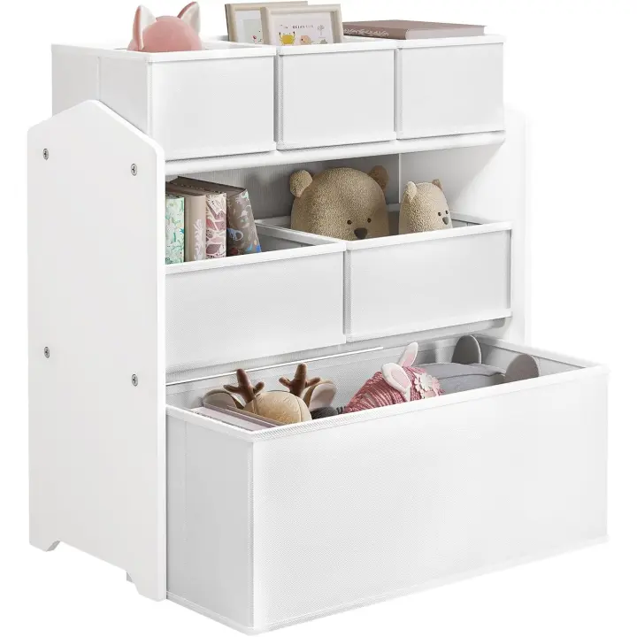 Lestarain Mueble de almacenamiento para habitación infantil de 3 niveles con 6 cajas extraíbles, estantería blanca de MDF con cajas de juguetes de tela no tejida para guardería, escuela, blanco, 63x30x60cm
