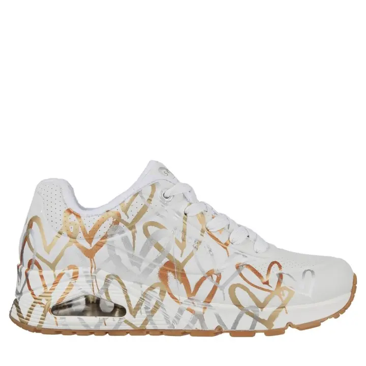 Cómoda Deportiva camara aire mujer UNO AIR METALLIC LOVE blanca en colaboración de Skechers x JGoldcrown y el icónico diseño #Lovewall. Plantilla Air Cooled Memory Foam® Altura Tacón bajo (1-3 cm) Referencia 155523-WTGD