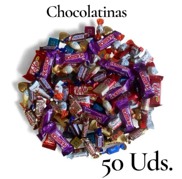 Caja con 50 chocalinas surtidas. Toblerone, Twix, Snickers, Ice cups, Kit-Kat, Schokobons, Kinder Bueno, Merci, Huesitos y Bombones. Mini chocolates