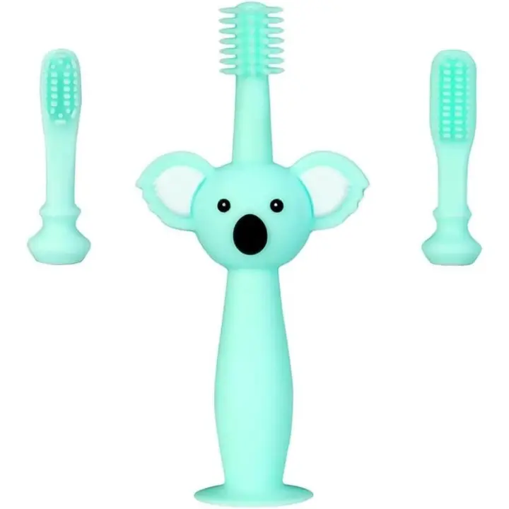 Vicloon Cepillo Dientes Bebe sin BPA , Cepillo de Dientes de Silicona, Mango de Koala, Diseño de Ventosa y Anillo Protector de Silicona, Cuidado Oral del Bebe con 2 Cabezales de Cepillo Reemplazables - Cian. Mango ergonómico