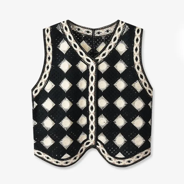 Chaleco De Punto Blanco Y Negro Para Mujer Boho Vacaciones Sin Mangas Botón Abierto Transparente Cuello V Corto Estilo Elegante