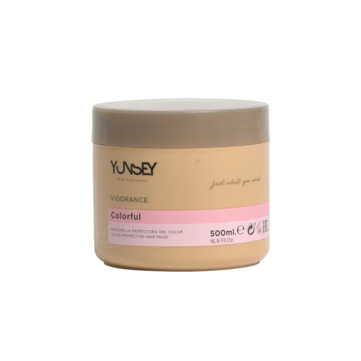 Yunsey Vigorance Colorful Mask 500 ml, a vegan hair mask for dyed hair that revives faded colors, repairs damage, and provides hydration, leaving hair soft and protected from daily wear.