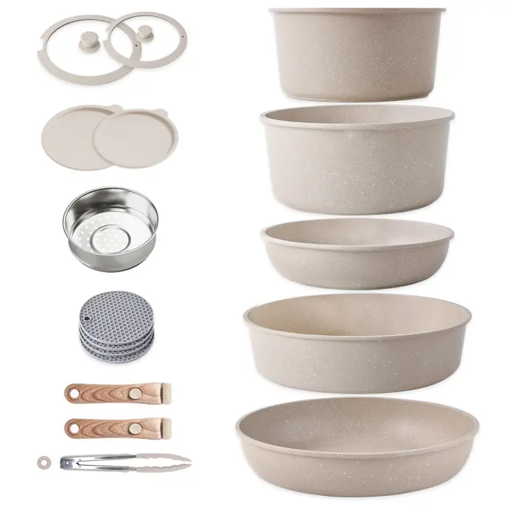 RIOVARM Inducción Juego de ollas y sartenes con asas Desmontables, Apilable Antiadherente Granito Sartenes y ollas con Tapas, Ahorro de espacio, Juegos de sartenes, Sin PFOA, Sartén
