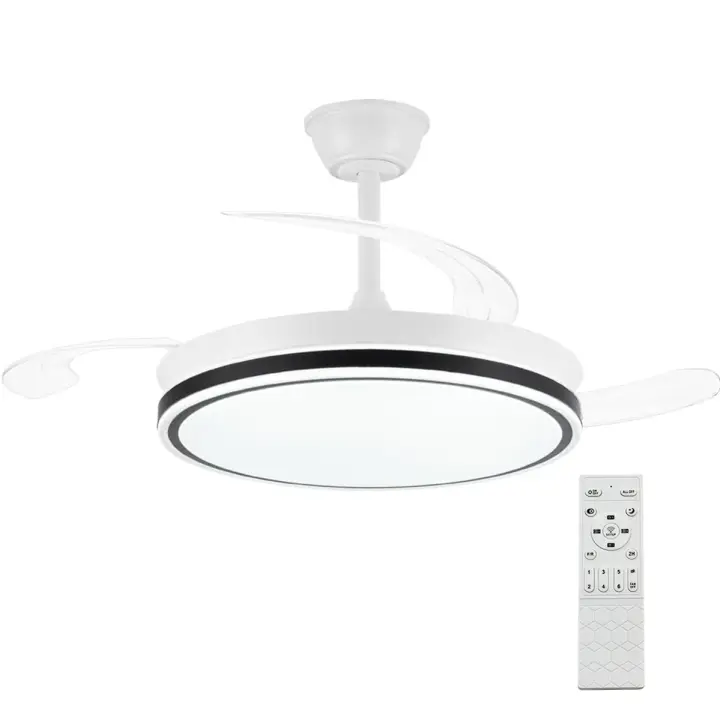 Ventilador de techo con luz led 45W modelo IRIS con aspas retráctiles blanco. Motor DC silencioso, Sistema CCT. Control remoto con temporizador, luz regulable en color e intensidad, Memoria, modo brisa y función invierno/verano