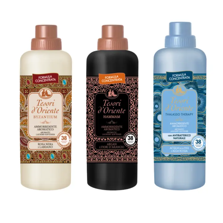 Tesori d'oriente suavizantes orientales arabes para la ropa pack de 3. Rosa Negra y Ládano, Aceite de argán y flor de naranja, Tsubaki y Peony japonés, GRANADA y TÉ ROJO, Agua de Fiji y algas rojas. Aromas orientales, aromas arabes, ropa suave y esponjosa