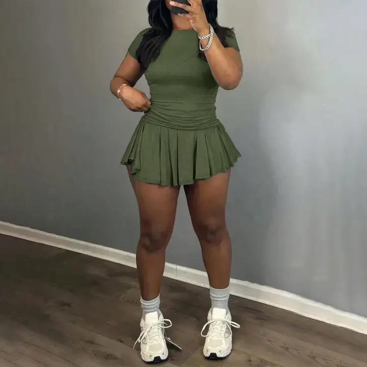 Conjunto De Dos Piezas Versátil Y De Moda - Top Y Pantalón/skirt En Negro/militar Verde Estilo Casual Para Mujer