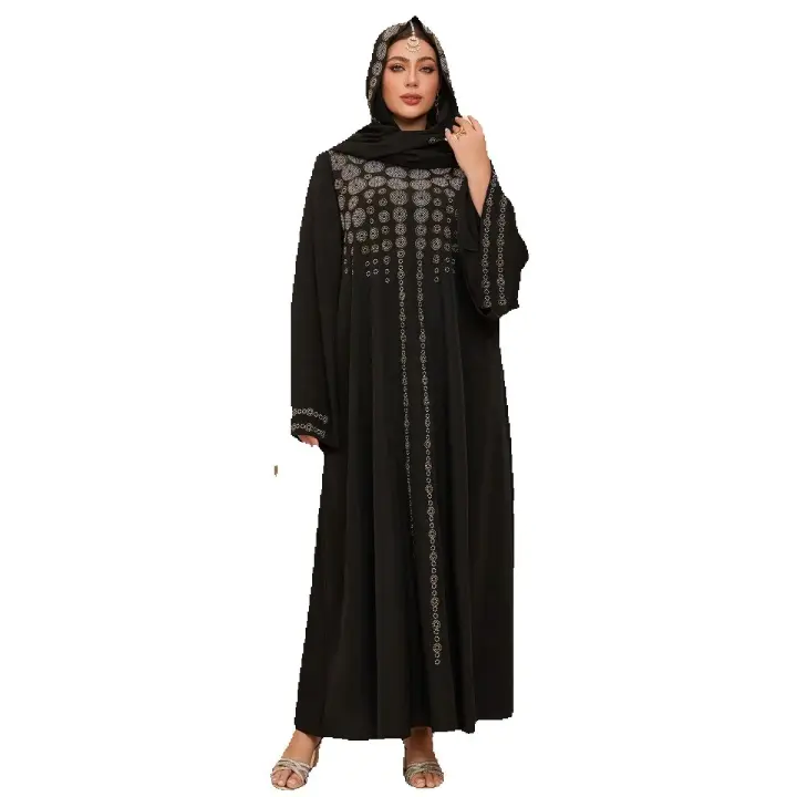 Nueva Burqa Conservadora Con Rhinestone Negro De Manga Larga Y Cuello Redondo Roba Del Medio Oriente Con Pañuelo (Talla Grande)