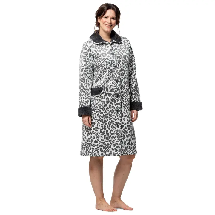 Egatex Elegante Bata Mujer Animal Print. Bata de Mujer Tejido Borreguito Animal Print de Egatex. 252522. Bata de mujer Egatex confeccionada en cálido tejido borreguito, perteneciente a la misma familia con estampado animal print. Su diseño de manga larga