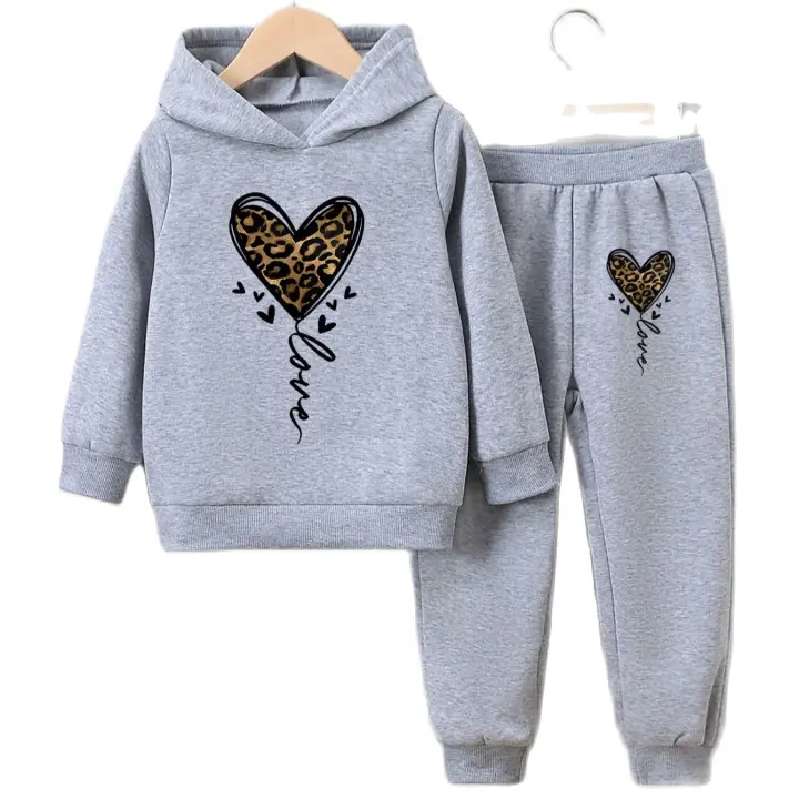Conjunto De 2 Piezas Para Niñas Con Estampado De Leopardo Y Corazón: Suéter De Capucha Y Pantalones Largos De Otoño E Invierno Con Lining De Poliéster Adecuado Para Niñas De 4-6 Años