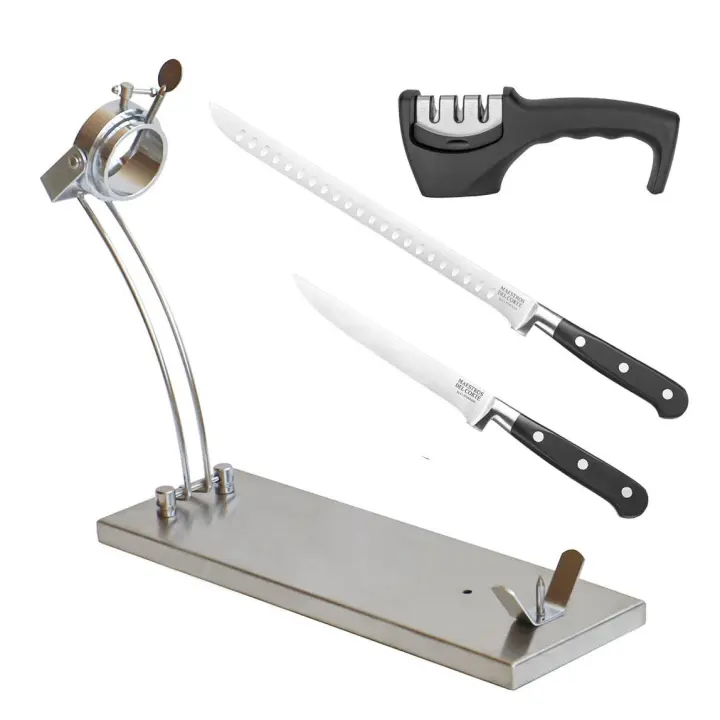 Cuperinox Jamonero Giratorio | Jamonera base Inoxidable | Soporte Jamonero Plegable | Incluye Cuchillo Jamonero Alveolos 25 cm, Deshuesador 15 cm, Afilador y Funda para Jamón | Apto Jamones y Paletilla | Soporte Jamon Profesional
