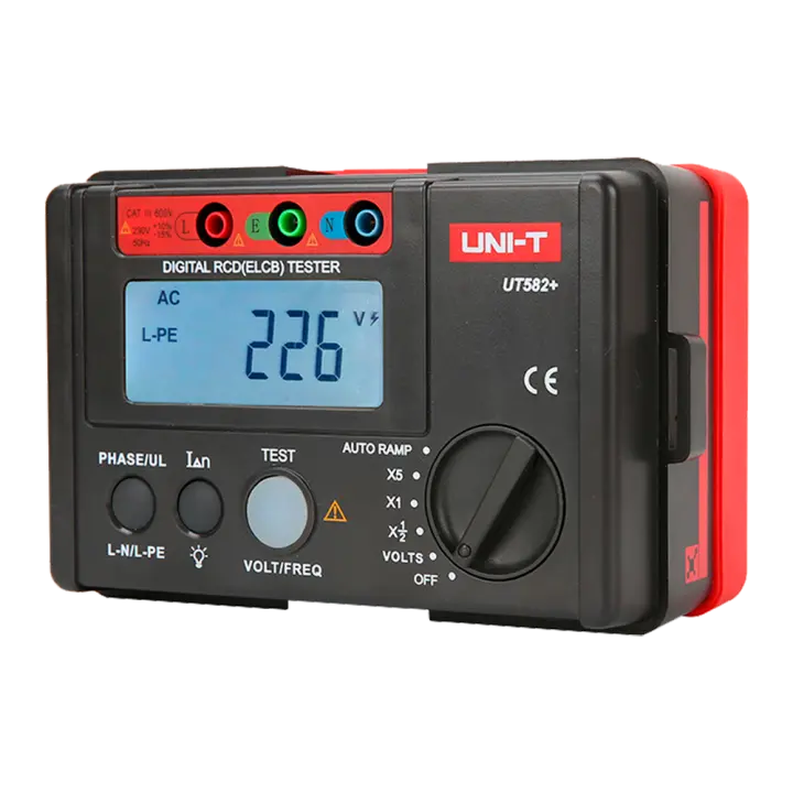Comprobador de tiempo de disparo de diferencial - Display LCD de hasta 1000 cuentas - Compatible con circuitos monofásicos 195V~253V - Medición de voltaje AC hasta 600V - Selector de fases 0º y 180º - Apagado automático