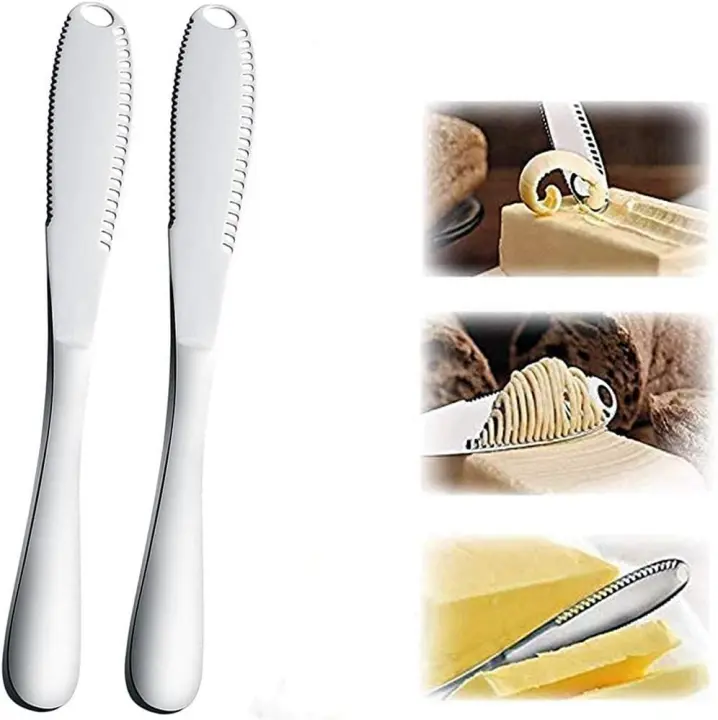 Cuchillo para mantequilla - 2 piezas- Cuchillo multifuncional para mantequilla- Cuchillo profesional 3 en 1 de acero inoxidable- Rallador de queso de cocina - Distribuye salsas uniformemente - Para mantequilla, queso, mermelada, crema - 20,5 x 2,5 cm