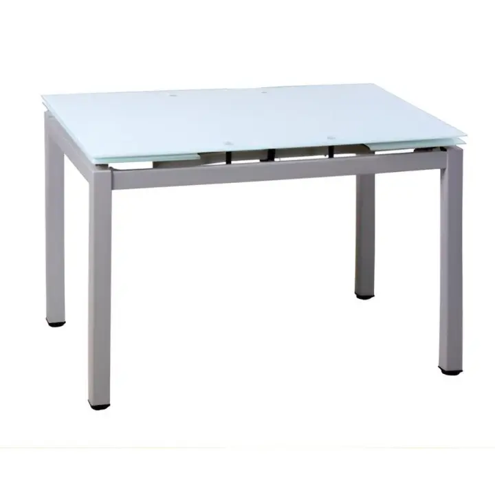 Mesa de cocina extensible Mod 70. Dos extensibles laterales y la tapa de cristal templado de color blanco.