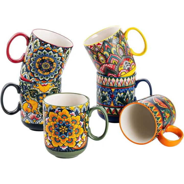Set 6 Tazas de Café, 400 ml Tazas Desayuno Mugs, Juego de Tazas de Leche, Tazas de Cerámica, Microondas y Lavavajillas, Estilo Bohemio Colorido
