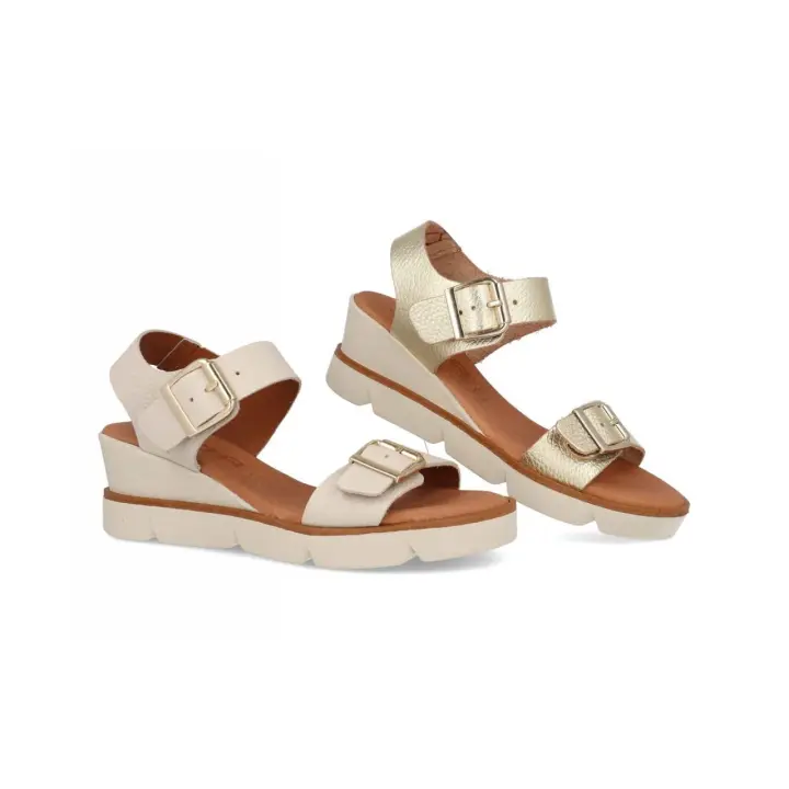 19410 - BDA SANDALIAS DE CUÑA COLORES : ORO , BEIGE TALLAS : 35 AL 41 CORTE EXTERIOR : PIEL FORRO INTERIOR : PIEL PLANTILLA : PIEL / GEL ALTURA TACÓN / CUÑA : 5,5 CM. PISO : SINTÉTICO