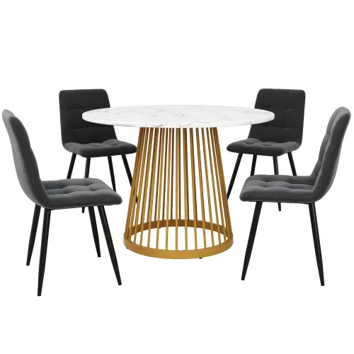 Ensemble de Calle à pesebre 5 pièces®RisingFF, 4 Chises, Plateau de Table en MDF or Blanc, chises de Calle à pesebre gris foncéEnsemble de Table à pesebre, 5 pièces, No 4 Chises, Ø 80 cm, O Blanc en MDF Noyer, Sillas en velours