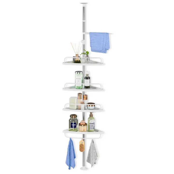 MAGIC SELECT Estantería Telescópica de Baño. Estante Esquina de Ducha de Plástico y Metal sin Taladro. Organizador de Bañera, Cocina, Lavabo de Altura Ajustable 180 a 325 cm con 4 Baldas, Toallero y 3 Ganchos