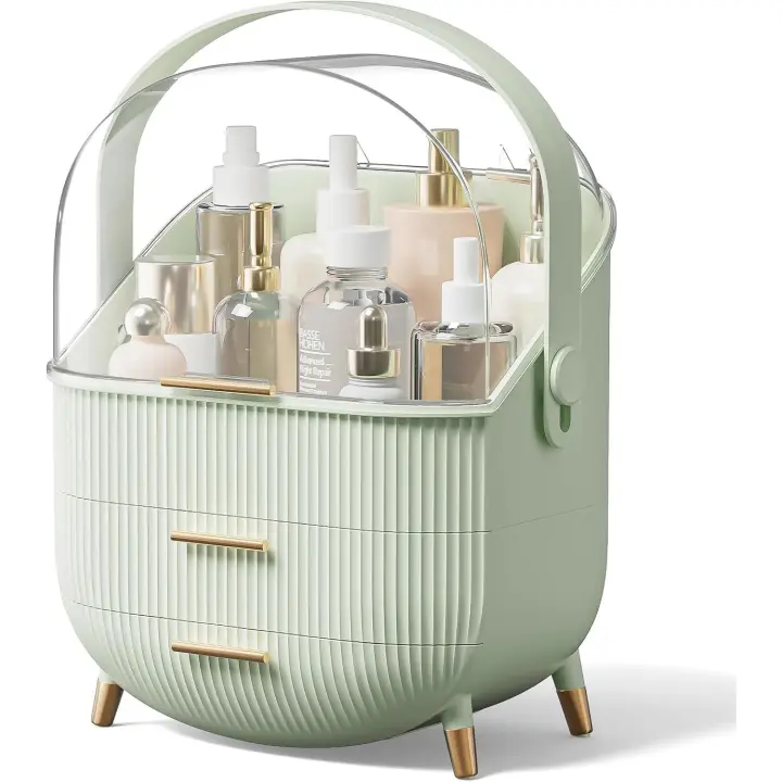 Vitrina grande para maquillaje con compartimento de almacenamiento de dos niveles y tapa transparente, tocador (verde menta)