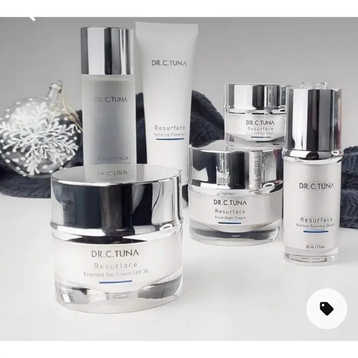 Dr. C. Tuna set Resurface de farmasi, compuesto por limpiador, tónico, sérum, contorno de ojos e hidratante de día y de noche.