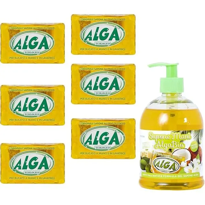 Jabón Orgánico de Algas: 6 Jabones Ecológicos de 400g + 1 Jabón de Manos PH Neutro 500ml - Para Lavar Manos y Lavadora, mil usos, versátil, aliado en la limpieza del hogar.