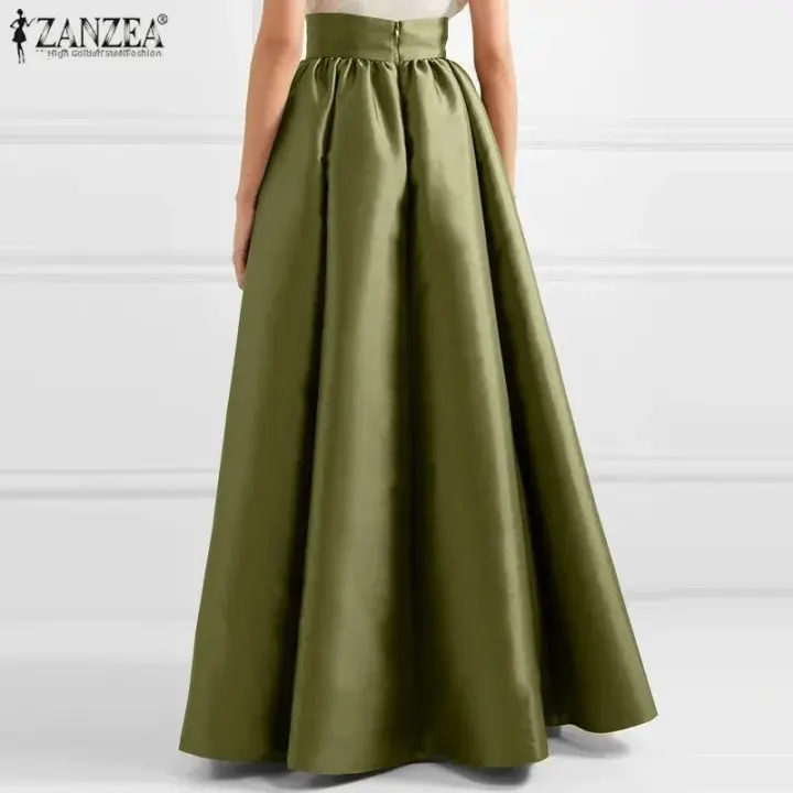 ZANZEA Falda De Satén Para Mujer Estilo Casual Vintage Elegante De Cintura Alta Largo Hasta El Suelo Color Sólido A-Line Oversized