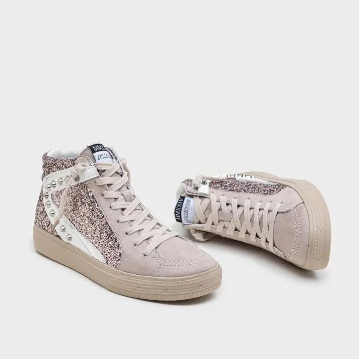 Zapatillas deportivas de caña alta para mujer con diseño moderno que combina glitter, detalles metálicos y ojales decorativos. Estilo urbano y trendy, perfectas para darle un toque brillante y atrevido a tus looks diarios