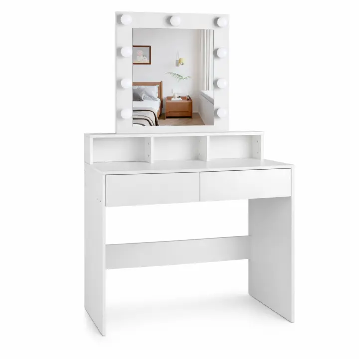 Tocador de Maquillaje con Luz LED Regulable, Mueble con Espejo y 10 Bombillas LED, Escritorio de Maquillaje con 2 Cajones y 6 Compartimentos, Montaje Fácil
