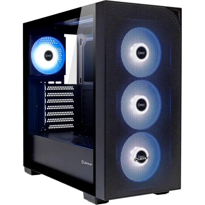Unykach revelat mesh compact edition caja atx, micro atx, itx - lateral de vidrio templado - 3.5”, 2.5” - usb-a 2.0, usb-3.0 y audio - 4 ventiladores argb - soporta refrigeracion liquida - color negro