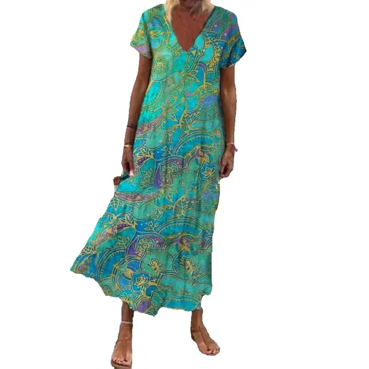Vestido Floral de rayón con escote en V para mujer, Túnica Bohemia de manga larga con abertura Vintage, talla grande, para playa, primavera y verano, color azul