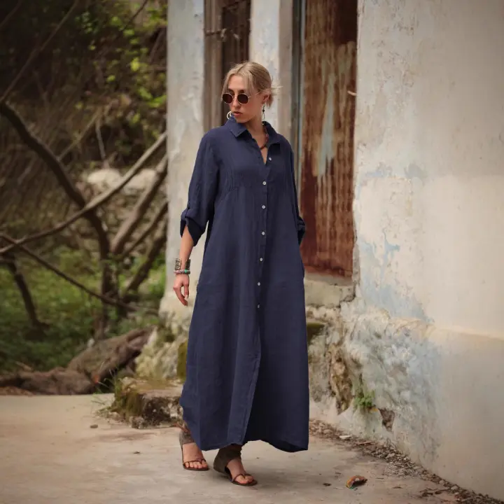 Vestido Largo De Algodón Y Lino Para Mujer Primavera/Verano Tallas Grandes L-5XL Estilo Neutro Elegante Manga Larga Cuello En V Color Sólido Casual