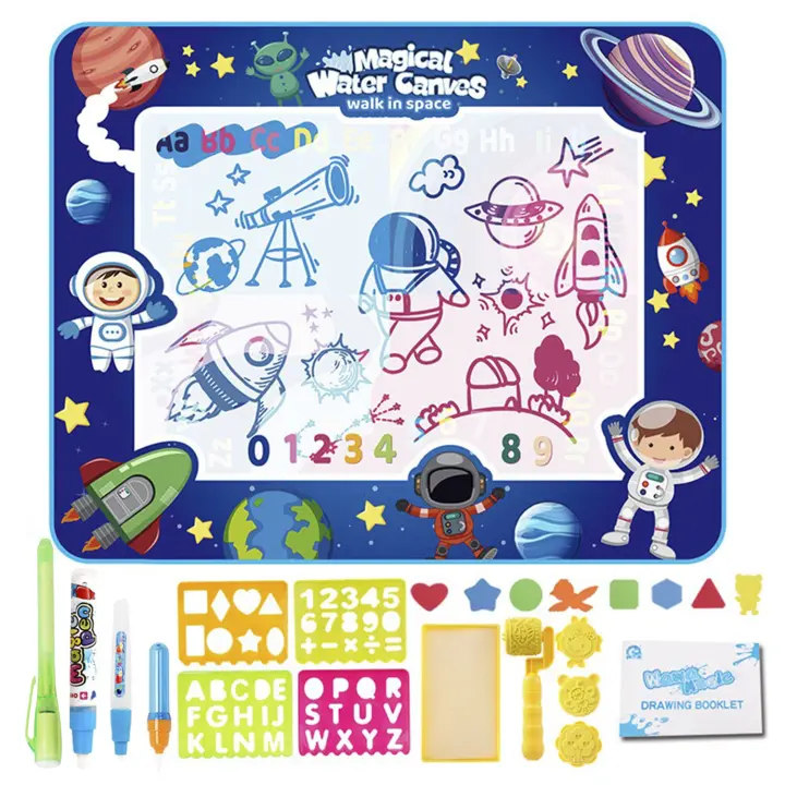 DAM. Pizarra infantil para dibujar con agua de 100x80cm. Brilla en la oscuridad. Incluye pintura de luz, 3 rotuladores de agua, plantillas de dibujo y escritura, tampones con formas y 8 figuras de EVA. 100x80x3cm.
