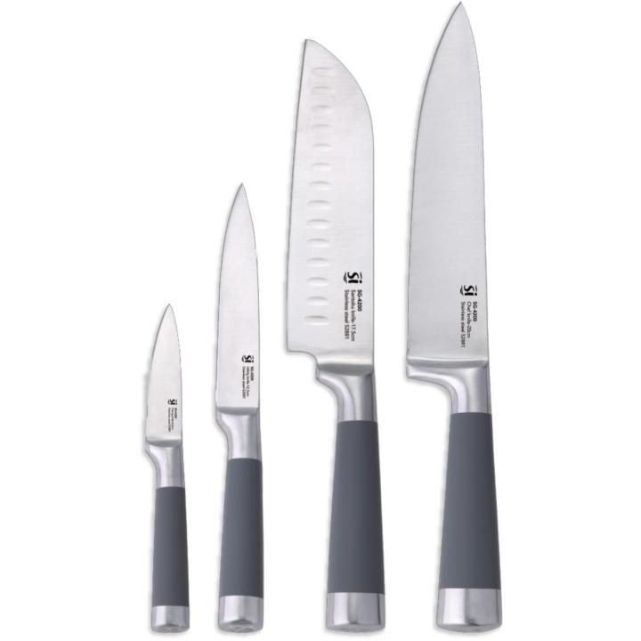 • SE COMPONE DE: • 1 CUCHILLO CHEF DE 20 cm.s. • 1 CUCHILLO SANTOKU DE 17,5 cm.s. • 1 CUCHILLO MULTIUSOS DE 12,5 cm.s. • 1 CUCHILLO PELADOR DE 9 cm.S.